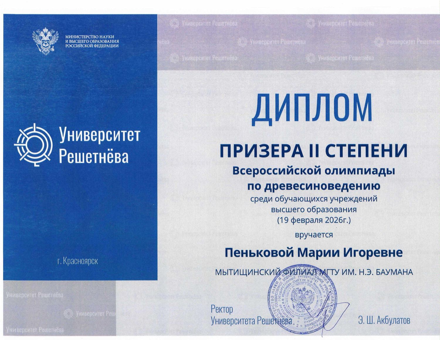 8 апреля 2026 годаПодведены итоги Всероссийскойолимпиады по древесиноведению среди студентов высших и средних профессиональных образовательных учреждений,состоявшейся 19 февраля 2026 г. на базе кафедры технологии композиционных материалов и древесиноведения ФГБОУ ВО"Сибирский государственный университет науки и технологий имени академика М.Ф. Решетнева" (Университет Решетнёва, г.Красноярск). Дистанционный формат олимпиады позволил принять участие студентам из Бийска, Екатеринбурга, Красноярска иКрасноярского края, Москвы, Мытищ, Санкт-Петербурга, Томска, Улан-Удэ, Уфы, Ханты-Мансийского автономного округа, Якутска.