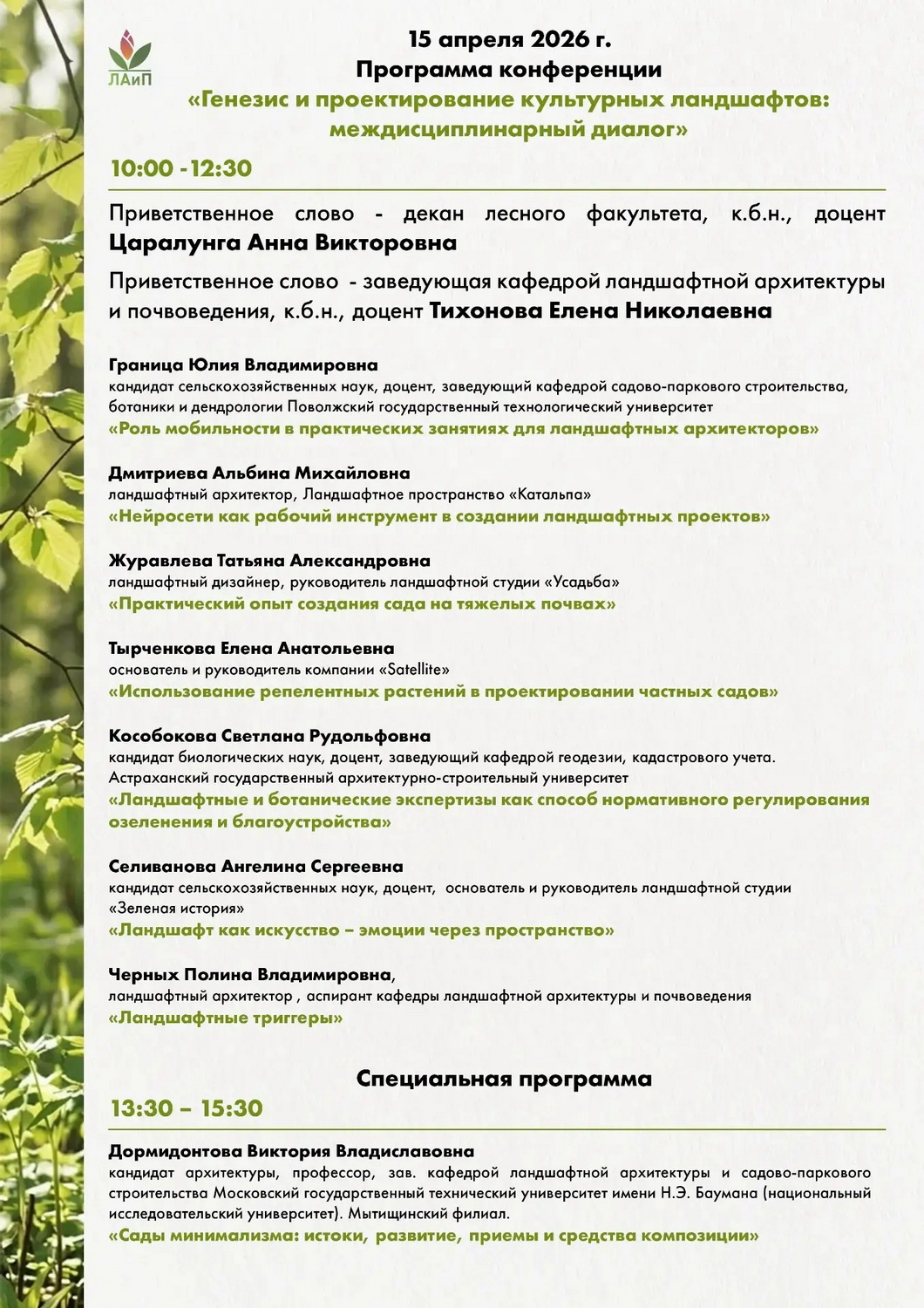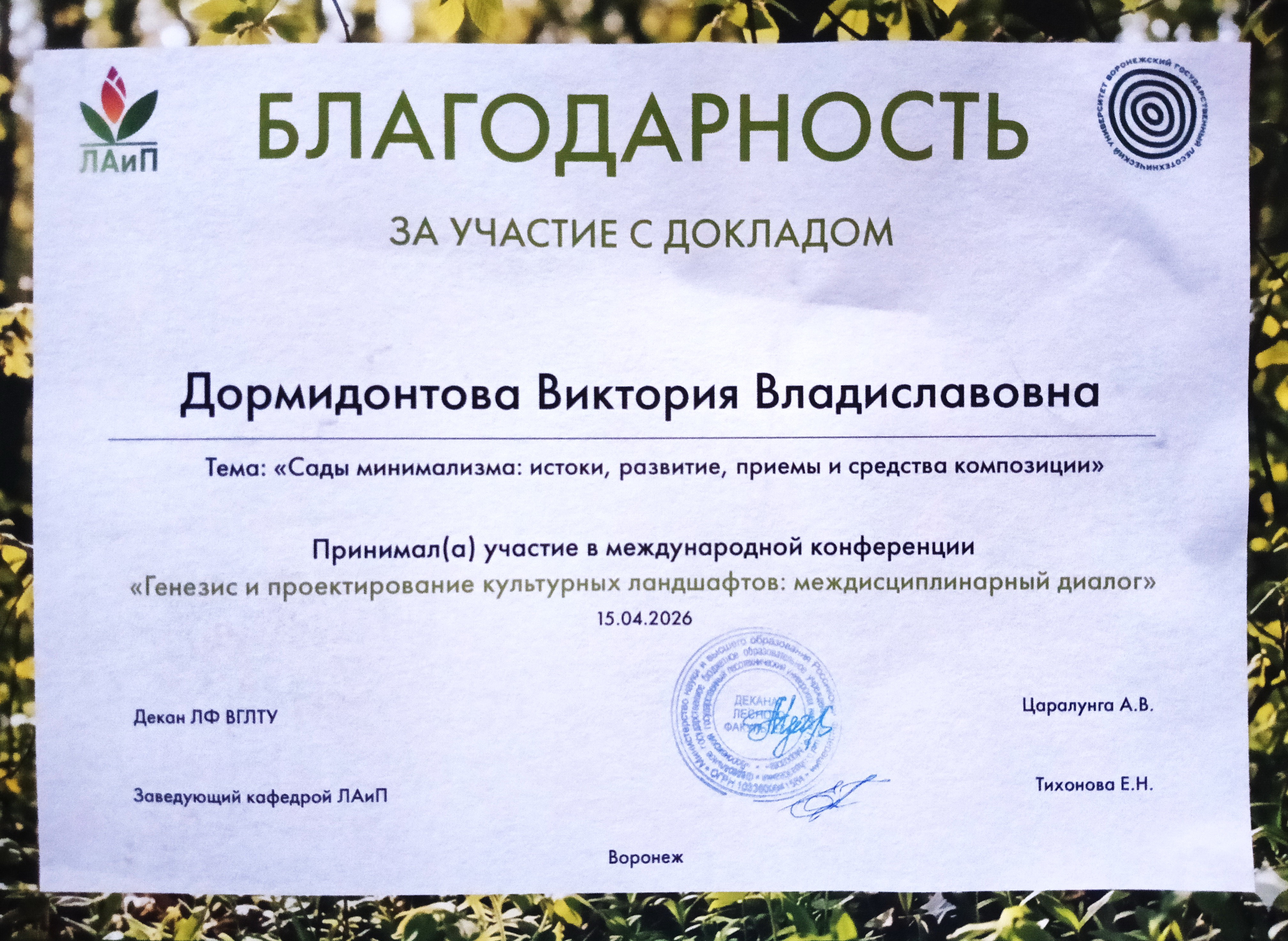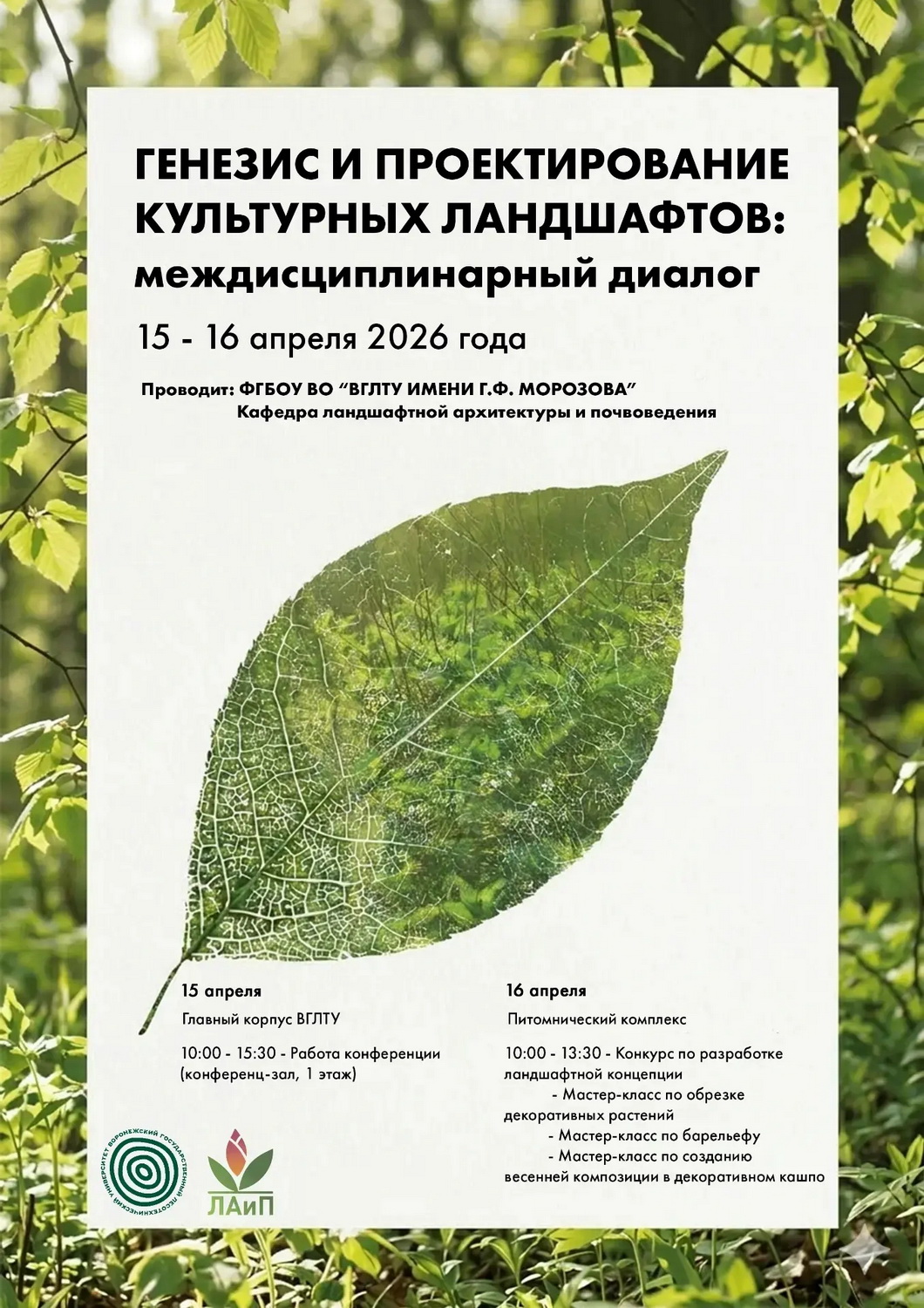 27 апреля 2026 годаНа базе ФГБОУ ВО «Воронежский государственный лесотехнический университет им. Г. Ф. Морозова» состоялась международная научно-практическая конференция «Генезис и проектирование культурных ландшафтов: междисциплинарный диалог».